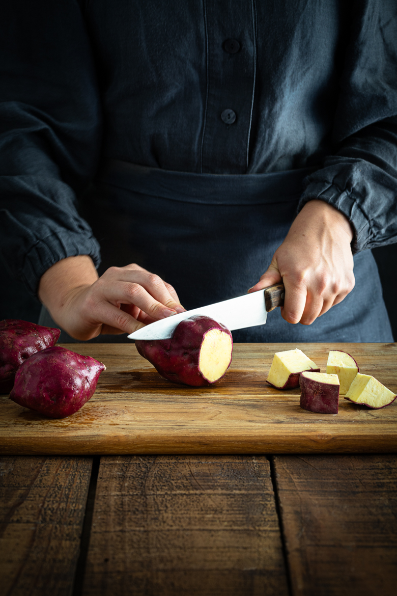 Boil both kumara in a large saucepan with 1 litre of water & 1 tsp salt. Take out the Purple Dawn kumara after 10 mins. It’s best to be slightly undercooked. Cool under cold water, then peel, dice and place in a bowl with the raisins.